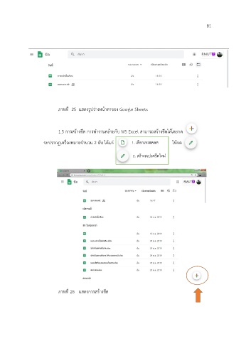 81 ภาพที่ 25 แสดงรูปร่างหน้าตาของ Google Sheets 1.5 การสร้างชีต การท างานคล้ายกับ MS Excel สามารถสร้างชีตได้โดยกด จะปรากฏเครื่องหมายจ านวน 2 อัน ได้แก่ ให้กด 1. เลือกเทมเพลต 2. สร้างสเปรคชีตใหม่ ภาพที่ 26 แสดงการสร้างชีต