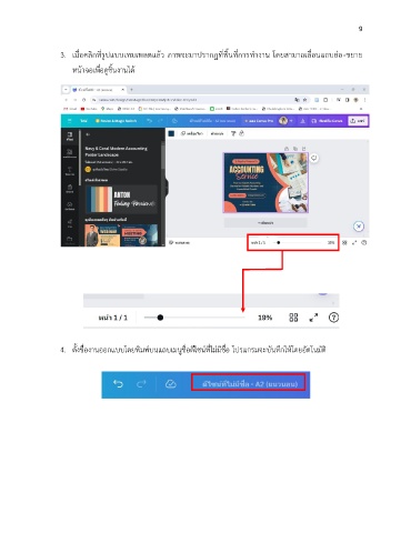 9 3. เมื่อคลิกที่รูปแบบเทมเพลตแล้ว ภำพจะมำปรำกฏที่พนที่กำรท ำงำน โดยสำมำถเลื่อนแถบย่อ-ขยำย ื้ หน้ำจอเพื่อดูชิ้นงำนได้ 4. ตั้งชื่องำนออกแบบโดยพิมพ์บนแถบเมนูชื่อดีไซน์ที่ไม่มีชื่อ โปรแกรมจะบันทึกให้โดยอัตโนมัติ