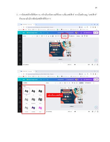 14 ิ่ ็ ็ ็ 11. กำรใส่เอฟเฟกต์ให้ข้อควำม คลิกเลือกข้อควำมที่ต้องกำรเพมเอฟเฟกต์ จำกนั้นคลิกเมนู "เอฟเฟกต์" ด้ำนบน แล้วเลือกสไตล์เอฟเฟ็กต์ที่ต้องกำร คลิกเลือกเอฟเฟ็กต์ c