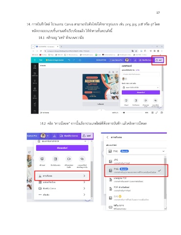 14. กำรบันทึกไฟล์ โปรแกรม Canva สำมำรถบันทึกไฟล์ได้หลำยรูปแบบ เช่น png, jpg, pdf หรือ gif โดย