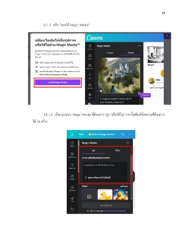 19 15.1.2 คลิก "ลองใช้ Magic Media" 15.1.3 เลือกรูปแบบ Magic Media ที่ต้องกำร (รูป หรือวิดิโอ) จำกนั้นพมพข้อควำมที่ต้องกำร ิ ์ ให้ AI สร้ำง