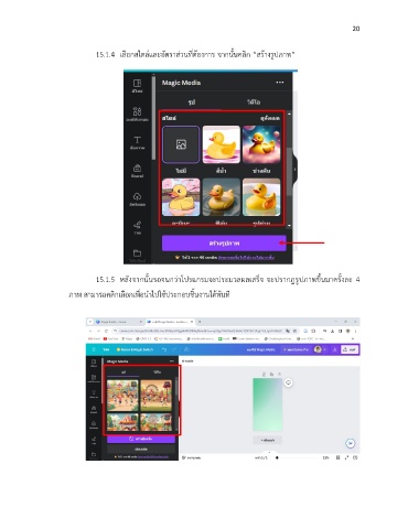 20 15.1.4 เลือกสไตล์และอัตรำส่วนที่ต้องกำร จำกนั้นคลิก “สร้ำงรูปภำพ” 15.1.5 หลังจำกนั้นรอจนกว่ำโปรแกรมจะประมวลผลเสร็จ จะปรำกฎรูปภำพขึ้นมำครั้งละ 4 ภำพ สำมำรถคลิกเลือกเพื่อน ำไปใช้ประกอบชิ้นงำนได้ทันที